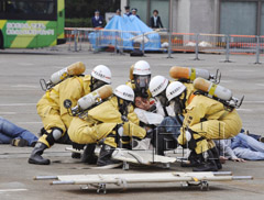 身着防护服的消防人员在放射性炸弹反恐演习中救治伤员。(共同社图)