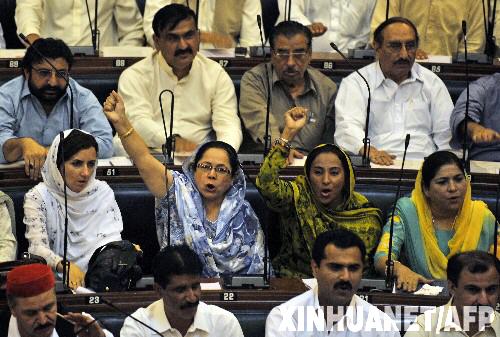 8月13日,巴基斯坦信德省的议员们在首府卡拉奇参加一次议会会议时高呼反对总统穆沙拉夫的口号。信德省议会当日通过一项议案,要求总统穆沙拉夫寻求信任投票。这是继旁遮普省议会、西北边境省议会之后第三个通过类似议案的省议会。 新华社/法新