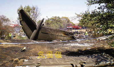 发生空难的地面一片焦黑,可见断开的机尾。