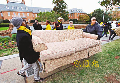 多名业主29日将家俬搬到房利美,抗议被收楼迫迁。
