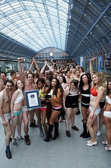在伦敦的圣潘克拉斯车站,寻求缔造最多人聚在一起仅身穿内衣的世界纪录,同时有数百人脱得只剩内衣,民众不禁侧目(见图)。