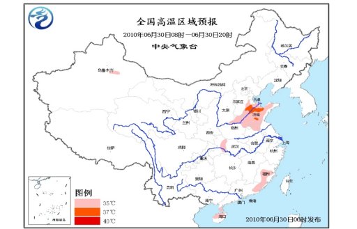 中新网6月30日电 据中国气象局网站消息,中央气象台今日6时继续发布高温蓝色预警,预计,今天白天,黑龙江、山西等地的高温天气将暂时告一段落,河北南部、河南东部和北部、山东大部、安徽北部、江苏西北部、湖北西部、福建中南部的部分地区、广东东部、海南北部等地将会出现35~37℃的高温。另外,预计未来几天,中国主要降雨带将明显北抬。