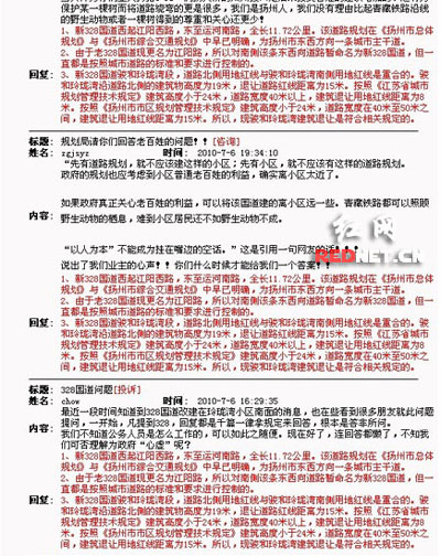 随后,记者又登陆到扬州市规划局的网站,在便民服务栏中,记者找到了网友所说的“史上最强大的回复”。记者看到,在便民服务栏中,只要是有关修建新328国道的问题,规划局的回复都是一模一样,随便数一数,这样的回复接近20个。“为什么我们的提问,规划局老是用千篇一律的回复来回答”、“答非所问,能踢就踢是吗”,在诸如此类的质疑后面,规划局还是以同样的说明来回复。