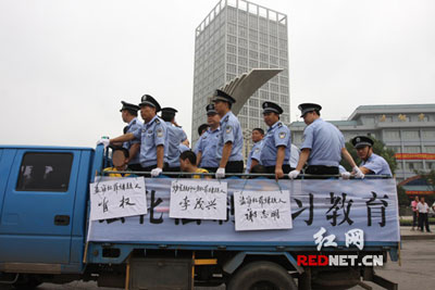 警察将犯罪嫌疑人押往公审现场。(图片来源:红网)