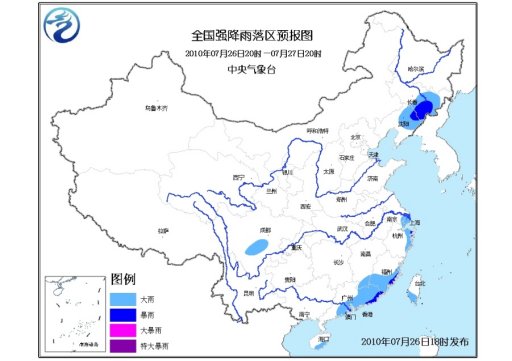 中新网7月26日电 据中央气象台消息,中央气象台7月26日18时继续发布暴雨蓝色预警:预计,7月26日20时到7月27日20时,吉林中东部、辽宁北部、四川盆地南部部分地区、浙江东部、福建东部和南部、江西南部、广东中东部、海南南部、台湾南部等地有大雨或暴雨,其中,浙江东部沿海、福建东部、广东东部等地的局部地区有大暴雨;上述局地并伴有短时雷雨大风等强对流天气。