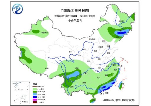 27日08时至28日08时,新疆西北部、西藏大部、甘肃南部、内蒙古东南部、东北大部、江淮大部、江南、华南、西南大部等地有小到中雨或阵雨,其中,吉林中南部、辽宁北部、四川西南部、云南西北部、浙江东部沿海、福建东部和南部、广东中东部、海南南部、台湾西部等地有大雨或暴雨,浙江东部沿海、福建东部沿海、广东东部等地的局部地区有大暴雨;上述局地并伴有短时雷雨大风等强对流天气。新疆北部、内蒙古东部、东北等地有4~5级风。受入海气旋和西南季风的共同影响,黄海南部海域、东海北部海域将有7~8级、阵风9~10级的旋转风;东海南部海域、台湾海峡、台湾以东洋面将有7~8级、阵风9级的西南风;黄海中部海域将有5~6级东南风转6~7级、阵风8级的旋转风。