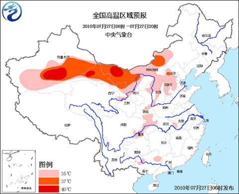 预计,今天白天,北京南部、河北中西部、山西大部、陕西东部、宁夏北部、重庆大部、湖北西北部和东南部、广西中部等地有35℃以上的高温天气,局地最高气温可达37~38℃;内蒙古中西部、甘肃中西部、新疆吐鲁番盆地及南疆盆地大部等地将有35~37℃的高温天气,局部地区最高气温可达40℃以上。
