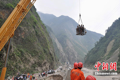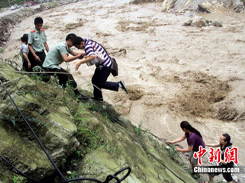 由于连续的降雨让绵茂公路汉旺至清平段多处出现的不同程度的塌方,道路中断。当消防官兵行至距离天池高桥段6公里处,山体滑坡留下的滚石和湍急的山洪将去路切断,消防车和救援船艇无法前行,情况紧急,中队长田海南迅速命令全体人员携带救援装备涉水前进。消防官兵立即将救援橡皮艇放入水中,哪知凶猛的洪流将橡皮艇冲得无法稳桨,被水中的乱石划破,无法使用救援工具,行进又万分艰难,消防官兵只得摸着山体,踏着过膝的洪水摸索前进。1个多小时后,终于到达了时发地点。此时,河床宽度达20余米,洪流湍急。