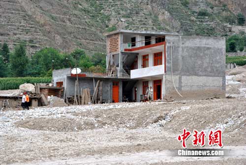 舟曲的月圆村和三眼村几乎痍为平地,然而在泥石流冲毁的砂石滩上,有一座房屋在干涸的泥石中央孤零零的挺立着,显得极为突兀。