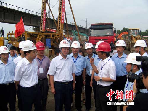 中新网成都8月24日电 (徐杨祎)24日下午,中共四川省委书记刘奇葆来到位于广汉境内的石亭江铁路大桥,视察因大桥垮塌造成列车坠江的抢险保通工作。