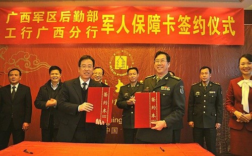 中新网南宁1月11日电(林浩)广西军区后勤部与中国工商银行广西分行1月11日在南宁签订了“军人保障卡”合作协议,全面铺开广西首批“军人保障卡”的发行工作。广西军区后勤部副部长梁开理在签约仪式上宣布,从下月起广西军区机关及直属队人员将委托工行通过军人保障卡代发工资,军人保障卡银行卡功能正式启用。