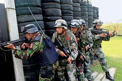 中方队员在射击训练中认真学习对方的“杀手锏”—— 特种射击“十步训练法”。第一步是快速转体对多个固定目标射击,要求在25米远,32秒内完成8次转体射击,且面对5个数字排序混乱的靶子。再一步就是运动中对多个固定目标射击训练,队员在搜索前进中,10发子弹,10秒内完成9个目标的射击……这种训练,既考验射击精度、速度,又考验反应能力。