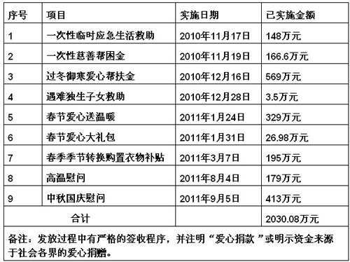 社会捐赠款按三大类项目发放。其一,定向捐赠;其二,《关于“11·15”火灾事故人身赔偿和相关救助的方案》中的爱心帮扶;其三,专项爱心帮扶。目前三大类项目共计发放2834.7万元(详见表一),其中专项爱心帮扶已安排9个项目(详见表二)。