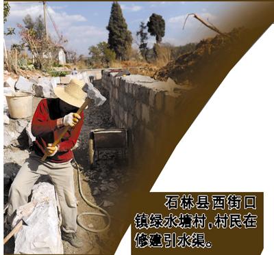 喀斯特地貌造就了石林的美誉,然而,连续3年的旱情,这种不积水的地层却让当地农民焦渴难耐。干旱造成石林全县4万多人饮水困难。据悉,截至1月29日,全县81座小型水库坝塘已干涸32座,1万多亩庄稼绝收。总库容196.7万立方米的圆湖水库如今水面不到原来的1/3,而新坝水库则完全干枯,绿水塘村的大水塘已经变成了一个大操场,村民可以在里面开拖拉机。