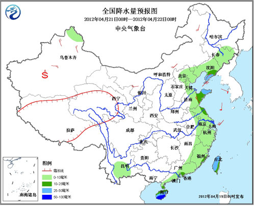 21日08时至22日08时, 南方强降雨明显东移南压并减弱,海南、广东珠江口附近地区及台湾等地有中到大雨,海南南部有暴雨(50~70毫米)并伴有强对流天气;华北东部、东北地区南部、黄淮东部等地有小雨,山东半岛和辽东半岛局地有中到大雨。新疆北部、内蒙古大部及环渤海地区等地有4~6级风;渤海海峡、黄海、东海北部风力有7~8级,阵风可达9级。