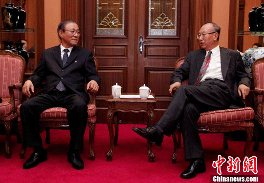 7月11日晚,前外交部副部长、中国-朝鲜友好协会会长武东和(右)在京会见了出席庆祝《中朝友好合作互助条约》51周年招待会的朝鲜驻华大使池在龙。中新社发 贾天勇 摄