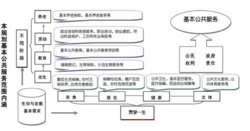 根据“十二五”规划纲要,为突出体现“学有所教、劳有所得、病有所医、老有所养、住有所居”的要求,本规划的范围确定为公共教育、劳动就业服务、社会保障、基本社会服务、医疗卫生、人口计生、住房保障、公共文化等领域的基本公共服务。