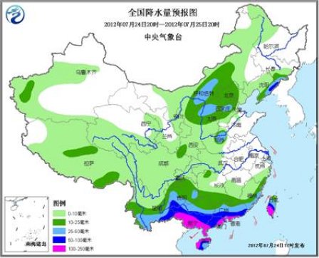 中新网7月24日电 据中央气象台预报,受到热带风暴“韦森特”影响,24日白天,华南大部分地区出现暴雨或大暴雨天气,华南沿海普遍出现7级以上大风。预计未来24小时,华南大部地区的暴雨仍将持续。