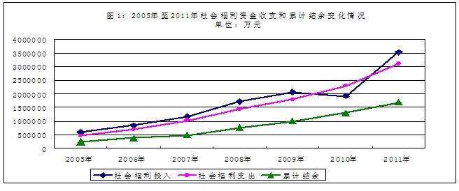 2011年,全国共筹集老年人、残疾人和儿童三项福利资金350.93亿元,比2005年增长4.99倍;支出合计311.43亿元,比2005年增长5.77倍;截至2011年底,三项资金累计结余169.52亿元,比2005年底增长5.6倍(2005年至2011年社会福利资金收支和累计结余变化情况见图1)。