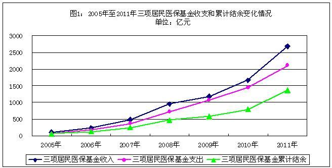 2011年,全国新农合、城镇居民医保和城乡居民医保(以下简称三项居民医保)基金收入合计2676.25亿元,比2005年增长了28.27倍,其中新农合基金收入1974.97亿元,城镇居民医保基金收入432.93亿元,城乡居民医保基金收入268.35亿元。三项居民医保基金支出合计2110.25亿元,比2005年增长了28.86倍,其中新农合基金支出1607.16亿元,城镇居民医保基金支出287.79亿元,城乡居民医保基金支出215.30亿元。截至2011年底,三项居民医保基金累计结余1363.78亿元,比2005年底增长25.98倍,其中新农合基金累计结余824.42亿元,城镇居民医保基金累计结余413.57亿元,城乡居民医保基金累计结余125.79亿元(2005年至2011年三项居民医保基金收支和累计结余变化情况见图1)。