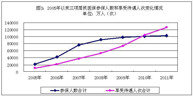 “十一五”期间是居民医疗保险全面建立和推广的关键时期,党中央、国务院把加快推进基本医疗保障制度建设作为深化医药卫生体制改革的五项重点改革任务之一,加大投入、加强引导,实现了基本医疗保障制度对城乡居民的全覆盖。2011年底,三项居民医保参保人数合计超过10亿人,当年享受待遇合计12.69亿人次,分别比2005年增长3.89倍和11.07倍(2005年以来三项居民医保参保人数和享受待遇人次变化情况见图3)。