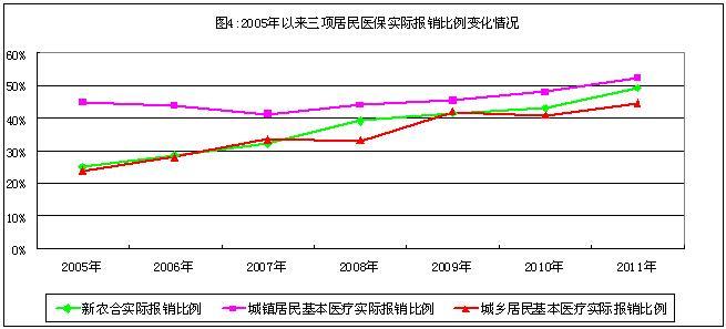 2005年以来,国家连续大幅调增新农合财政补助水平,各级财政对新农合的补助标准从2005年的每人每年20元增加至2011年的200元。截至2011年底,已将儿童白血病、先天性心脏病等8个重大疾病纳入新农合重大疾病保障范围。新农合和城镇居民医保政策范围内的报销比例逐年提高,到2011年报销比例分别达到了70%和62%。实际报销比例近年来也稳步上升,农村尤为显著。新农合、城镇居民医保和城乡居民医保实际报销比例分别由2005年的24.8%、45%和23.78%,提高到2011年的49.20%、52.28%和44.87%,分别增长了98.39%、16.18%和88.69%(2005年以来三项居民医保实际报销比例变化情况见图4)。