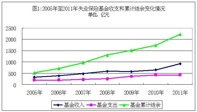 2011年,全国失业保险基金收入合计923.81亿元,比2005年增长1.70倍;基金支出合计433.44亿元,比2005年增长1.08倍;截至2011年底,基金累计结余2231.03亿元,比2005年底增长3.30倍(2005年至2011年失业保险基金收支和累计结余变化情况见图1)。