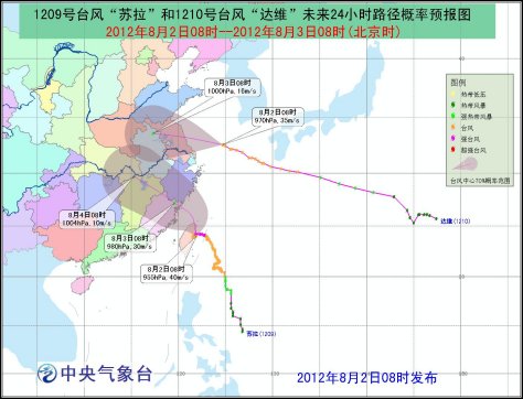 预计,“苏拉”将以每小时15公里左右的速度向西北方向移动,穿过台湾岛,逐渐向福建中部到浙江南部一带沿海靠近,将于2日晚上到3日上午在福建莆田到浙江玉环一带沿海登陆;“达维”将以每小时30-40公里的速度向西偏北方向移动,逐渐向江苏中部到山东半岛南部沿海靠近,将于2日傍晚到夜间在江苏盐城到山东青岛一带沿海登陆。
