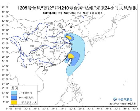 受“达维”和“苏拉”的共同影响,8月2日20时到8月3日20时,巴士海峡、巴林塘海峡、台湾海峡、台湾以东洋面、东海南部、黄海中部和南部、山东半岛南部沿海、江苏沿海、长江口区、上海沿海、浙江沿海、福建沿海、台湾沿海将有7-9级大风,部分海域或地区的风力有10级,“苏拉”和“达维”中心经过的附近海域或地区的风力有11-13级,阵风可达14-15级;东海北部、南海东北部和南海南部海域将有6-8级大风、阵风可达9级;辽宁南部、河北东部、山东、江苏大部、河南东北部、安徽东北部、上海、浙江、江西东北部、福建中北部、台湾等地有大到暴雨,其中,山东东南部、江苏东北部、浙江南部、福建东部、台湾中北部等地的部分地区有大暴雨(100~200毫米),福建北部沿海、浙江东南部沿海、台湾西部等地的局部地区有特大暴雨(250~400毫米)。