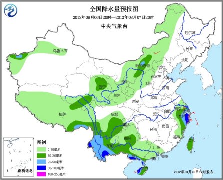 6日20时至7日20时,浙江中东部、福建东北部、江苏南部、上海、台湾等地有中到大雨,浙江东部有暴雨,局地大暴雨(100~150毫米);另外,内蒙古中部、四川南部、西藏东南部、云南、广西南部、海南等地有中到大雨,其中,云南西部和南部、广西南部、海南西部的局部地区有暴雨(50~80毫米)。东海、浙江东部及沿海、上海、台湾海峡有7~9级、部分海域或地区风力可达10~11级大风,“海葵”中心附近风力有12~14级,阵风可达14~16级。