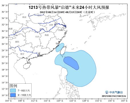 受“启德”影响,14日20时到15日20时,台湾东南洋面及台湾东部沿海、巴士海峡、巴林塘海峡、菲律宾吕宋岛以东洋面将有7-8级大风,“启德”中心经过的附近海域风力可达9-10级,台湾海峡也将有6-7级大风,阵风8级;台湾东部将有中到大雨。