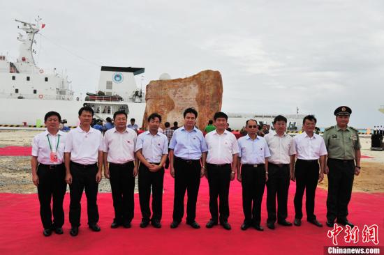 7月24日上午10时40分,在西沙永兴岛原海南省西南中沙办事处大楼前广场上,五星红旗高高飘扬,海南省三沙市成立大会暨揭牌仪式隆重举行。成立大会上结束后,中共海南省省委书记罗保铭为三沙市“地名碑”揭碑。该碑重65吨,由海南省政府为纪念三沙市成立而设立。中共海南省委书记、海南省人大常委会主任罗保铭(左5)、中共海南省委副书记李宪生(左6)与三沙领导班子成员在“地名碑”前合影。 中新社发 骆云飞 摄