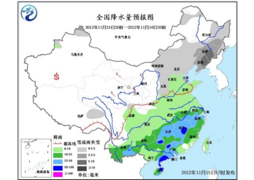 15日20时至16日20时,新疆西北部、西藏东北部、内蒙古中东部、华北西部和北部、东北地区大部等地有小雪或雨夹雪,其中,黑龙江东南部、吉林中东部、辽宁中东部等地的部分地区有中到大雪;华北南部、黄淮、江淮、江汉、江南、华南大部、西南地区东部和南部、台湾等地有小到中雨或阵雨,其中,浙江西部、江西大部、湖南中部、广东中西部、广西东北部、海南南部和东北部、云南东南部等地有大雨、局地暴雨。青海、甘肃、宁夏、内蒙古西部等地有4~6级风。台湾海峡有6~7级、阵风8级东北风,南海东北部有6~7级、阵风8级的偏东风。