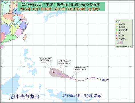 中新网12月1日电 据中央气象台消息,今年第24号台风“宝霞”于12月01日凌晨加强成为强台风,01日02时其中心位于美国关岛南偏西方大约1020公里的西北太平洋洋面上,就是北纬4.4度,东经143.0度,中心附近最大风力14级(42米/秒),中心最低气压960百帕。