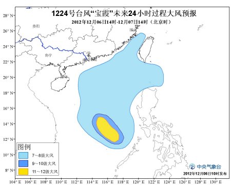 受“宝霞”和南下冷空气的共同影响,6日14时到7日14时,南海东南部海域将有7-10级大风,“宝霞”中心经过的附近海域的风力可达11-13级,阵风可达14级;台湾海峡、巴士海峡、巴林塘海峡、南海北部、南海中部、南海西南部的部分海域也将有7-8级大风。