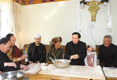 时近中午,薄金清一家热情地邀请陈全国在他们家包饺子、过新年。陈全国愉快地接受了邀请。擀皮儿、包馅儿、码盘儿,陈全国一边包饺子,一边与一家人聊天。看到一起包饺子的一家人穿着不同的民族服饰,陈全国笑着对薄金清说:“老薄,你家可是民族团结的典范啊。”薄金清说,自己一家二十多口人,有汉、藏、回三个民族,关系融洽、其乐融融。陈全国语重心长地说,中华民族是一个大家庭,各个民族都是这个家族的一员。我们一定要倍加珍惜民族团结、全力维护祖国统一,坚决与十四世达赖集团的分裂渗透破坏活动作斗争,努力建设富裕和谐幸福法治文明美丽西藏,确保西藏与全国各族人民一道如期全面建成小康社会。