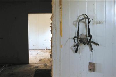 2013年3月20日,一只带着吊牌的面罩挂在小汤山医院残余的墙上。新京报记者 王嘉宁 摄