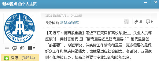 习近平在天津和高校毕业生、失业人员等座谈时,问村官杨代显“情商重要还是智商重要?”杨代显回答“都重要”。习近平说,做实际工作情商很重要,更多需要的是做群众工作和解决问题能力,也就是适应社会能力。老话说,万贯家财不如薄技在身,情商当然要与专业知识和技能结合。