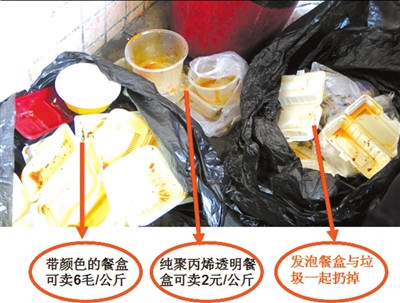 调查发现,在北京一办公场所,一名保洁员拿着黑色垃圾袋收集垃圾时,将带颜色的餐盒和透明餐盒分拣出,把发泡餐盒与其他垃圾装在一起。经询问得知,保洁员把带颜色PP塑料餐盒和纯PP透明餐盒,分别以每公斤0.6元和每公斤2元的价格卖给蹬三轮收废品的商贩。当问到白色发泡餐盒为何与生活垃圾装在一起时,保洁员拿着发泡餐盒说:“这是废品,不能用,就当垃圾处理了。”