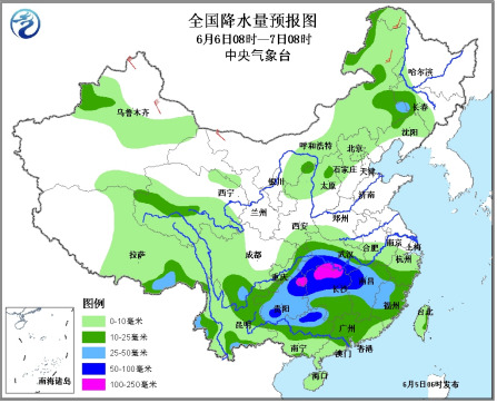 6月6日08时至7日08时,新疆北疆西部、青海中部、内蒙古东部、吉林西部、辽宁西部、江汉南部、江南大部、华南大部、四川南部、云南西部和南部、贵州大部、西藏南部等地有中到大雨,其中,湖北南部、湖南北部、江西西北部、贵州东北部和西南部、广西北部等地的部分地区有暴雨,局地大暴雨(100~150毫米);上述地区局地并有短时雷雨大风或冰雹等强对流天气。新疆北部、内蒙古西部和东部等地有4~6级风。