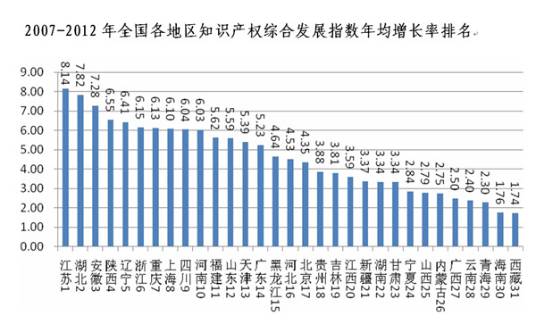 报告显示,2007年以来,我国知识产权综合发展水平逐年提升,特别是2008年实施《国家知识产权战略纲要》以后,提升速度明显加快。2012年知识产权综合发展指数位列全国前10位的依次是广东、上海、北京、浙江、江苏、山东、福建、湖北、安徽和四川。从发展速度来看,2007年至2012年间,综合发展指数年均增长率位居全国前10位的省市分别是江苏、湖北、安徽、陕西、辽宁、浙江、重庆、上海、四川和河南。分经济区域来看,我国知识产权综合发展指数呈现出东、中、西部地区逐级递减的趋势,区域差别显著。东部地区知识产权综合发展指数平均值达到73.25,远高于西部地区51.73的平均值。