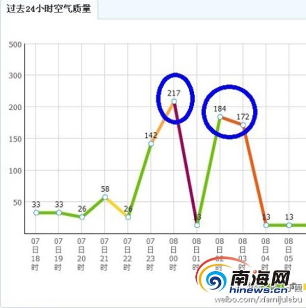 然而6月8日晚,新浪微博用户“@主持人于霞”发布微博称,根据实时监测数据发现,三亚昨天的3个时段的空气污染指数均超过150,达到四级和五级污染。随后,南海网记者在其微博链接的网站中看到了上述数据。在6月8日凌晨0时,三亚的空气污染指数为217,为重度污染,8日凌晨2时、4时也分别达到中度污染。