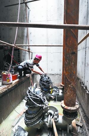 6月5日,蓄水池底层抽水泵安装完毕,工人正在做最后的检查。