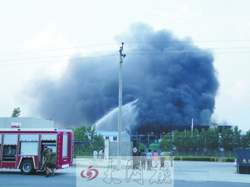 当天下午6时30分,记者赶到火灾现场。事发现场已被民警封锁,公司门口停靠着增援的消防车及环保检测车。正对公司大门的三层生产车间大楼内火势凶猛,浓烟升腾四五十米高。着火大楼的上空,形成了一个巨大的黑色烟雾团。