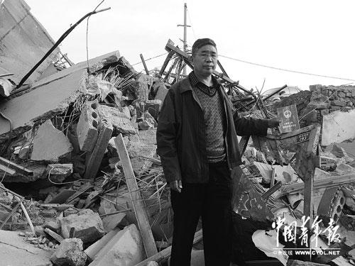 钟清先拿着房屋产权证,站在自家房屋的废墟前。(摄于5月15日)本报记者 丁先明摄
