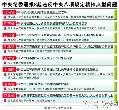 中央纪委最新通报的8起违反中央八项规定精神的典型问题分别来自河南、广东、四川、湖北、吉林、上海、湖南、河北等8个省市,涉及的问题包括:违规公款吃喝玩乐、公款旅游、违规接受宴请和收受礼金,为子女大办婚宴收取礼金等。通报称,相关责任人已受到追究。