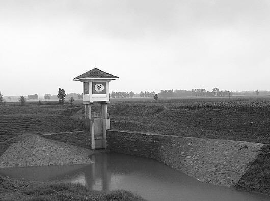 东梁庄村北头,紧挨着成片的玉米地,一条输水渠刚刚竣工。河道深约5米,河沿砌石护坡。河流之上,矗立着一处水闸建筑,最高处醒目地印着蓝绿相间的“南水北调”工程主标志,墙上还贴着山东省公安厅和山东省国土资源厅等联合下发的《关于加强南水北调工程管理的通告》。