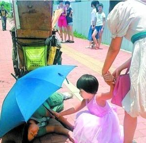 昨天,媒体报道了这样一则让人五味杂陈的新闻:一个环卫工昏倒在地,路人观望不敢上前,只有一名小女孩蹲下为她撑伞,在孩子的感召下,两名路人终于出手相救。新闻甫一传开,瞬间搅动全城舆论,有关社会冷漠的反思再次重击世道人心。
