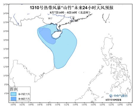 受“山竹”和西南季风的共同影响,7日14时到8日14时,南海西部、北部湾、琼州海峡及海南沿海、广东雷州半岛西部沿海、广西南部沿海将有6~7级大风,“山竹”中心经过的海面和地区的风力可达8~9级。海南中南部、广西南部等地有大雨或暴雨。