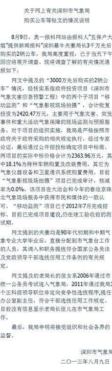 10日,深圳市气象局就公开发表了情况说明:网文中提及的“3000万先后购买2辆公车”情况,经核实为政府投资项目《深圳市气象灾害应急预警工程》中的两个子项目“移动监测”和“气象影视现场拍摄”,合计批复投资为2420.47万元,主要用于气象灾害、突发事件和重大活动气象保障的现场监测与预报服务。